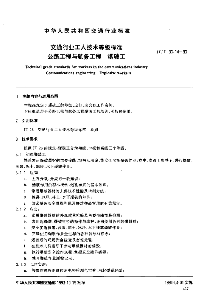 JT/T 33.14-1993 交通行业工人技术等级标准公路工程与航务工程爆破工