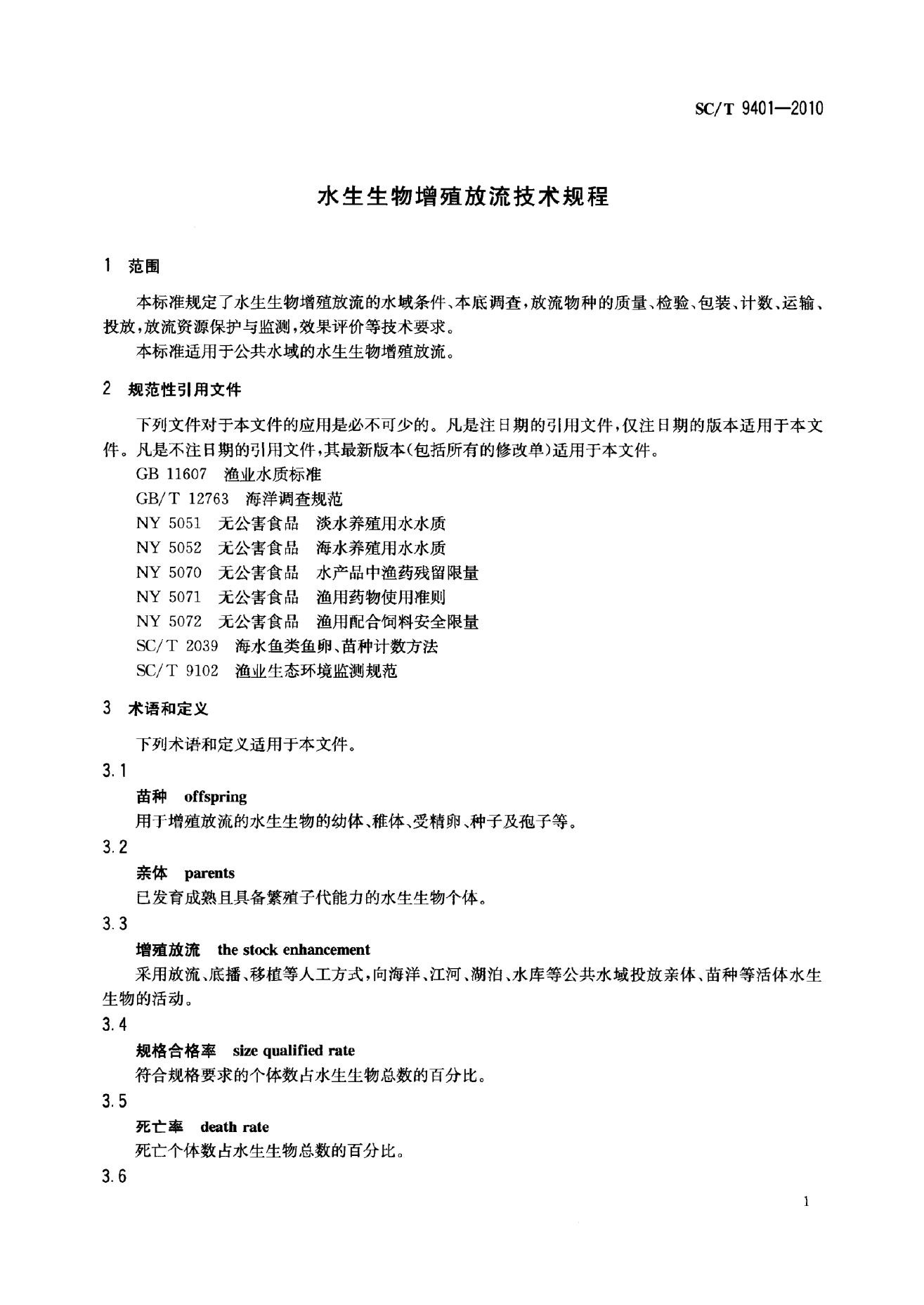 SC/T 9401-2010 水生生物增殖放流技术规程