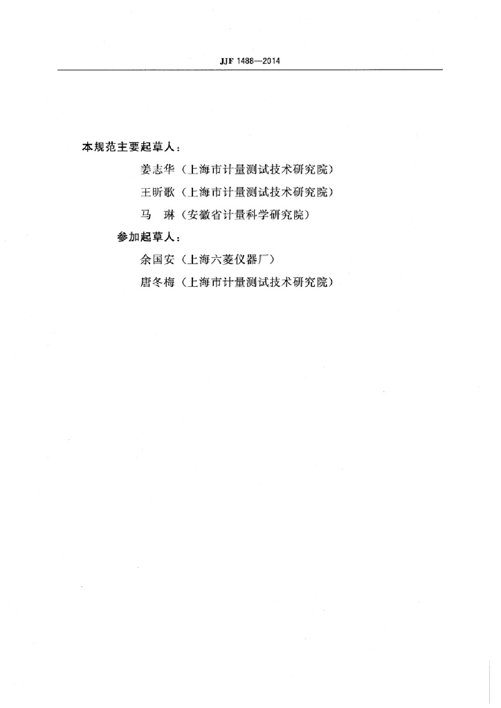 姜志华(上海市计量测试技术研究院)、王昕歌(上海市计量测试技术研究院)、马琳(安徽省计量科学研究院)、余国安(上海六菱仪器厂)、唐冬梅(上海市计量测试技术研究院)