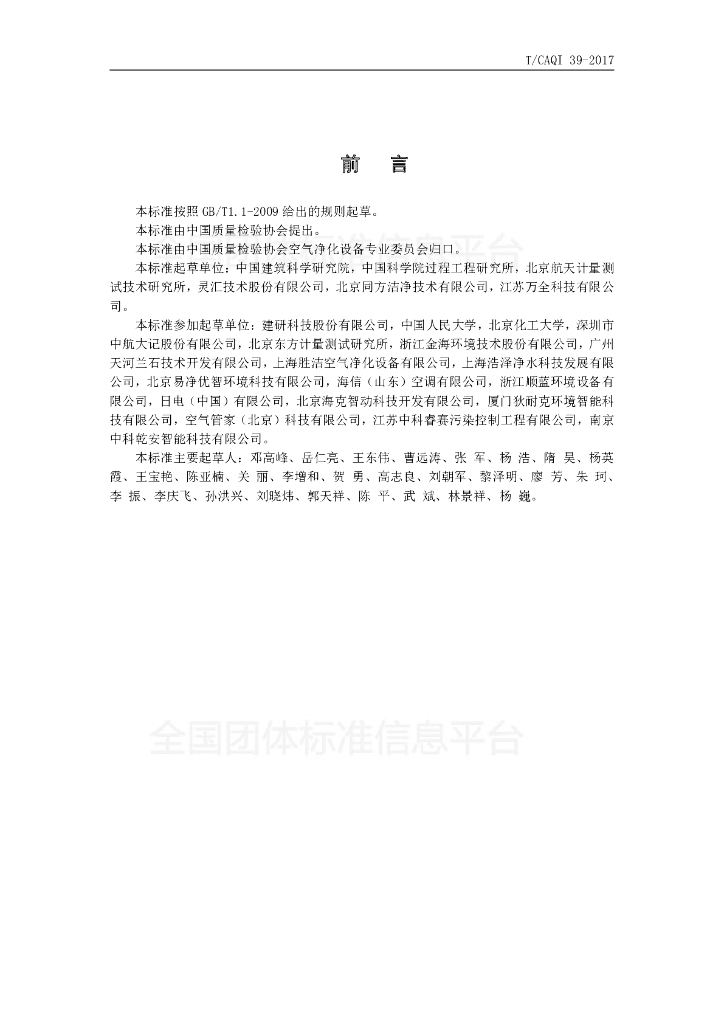中国建筑科学研究院、中国科学院过程工程研究所、北京航天计量测试技术研究所、灵汇技术股份有限公司、北京同方洁净技术有限公司、江苏万全科技有限公司、建研科技股份有限公司、中国人民大学、北京化工大学、深圳市中航大记股份有限公司、北京东方计量测试研究所、浙江金海环境技术股份有限公司、广州天河兰石技术开发有限公司、上海胜洁空气净化设备有限公司、上海浩泽净水科技发展有限公司、北京易净优智环境科技有限公司、海信(山东)空调有限公司、浙江顺蓝环境设备有限公司、日电(中国)有限公司、北京海克智动科技开发有限公司、厦门狄耐克