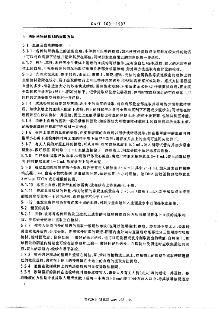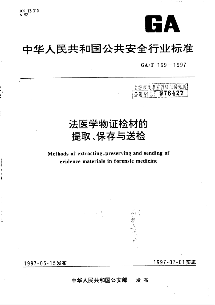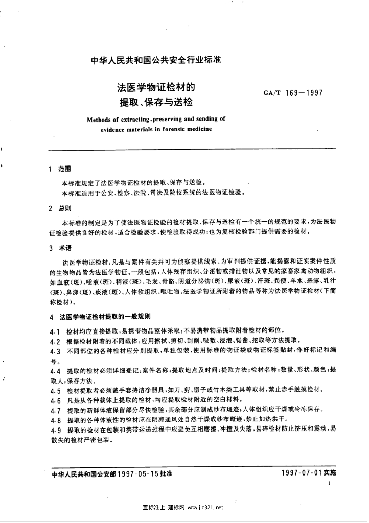 GA/T 169-1997 法医学物证检材的提取、保存与送检