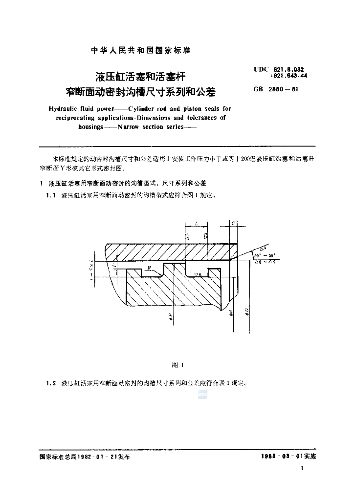 GB/T 2880-1981 液压缸活塞和活塞杆 窄断面动密封沟槽尺寸系列和公差