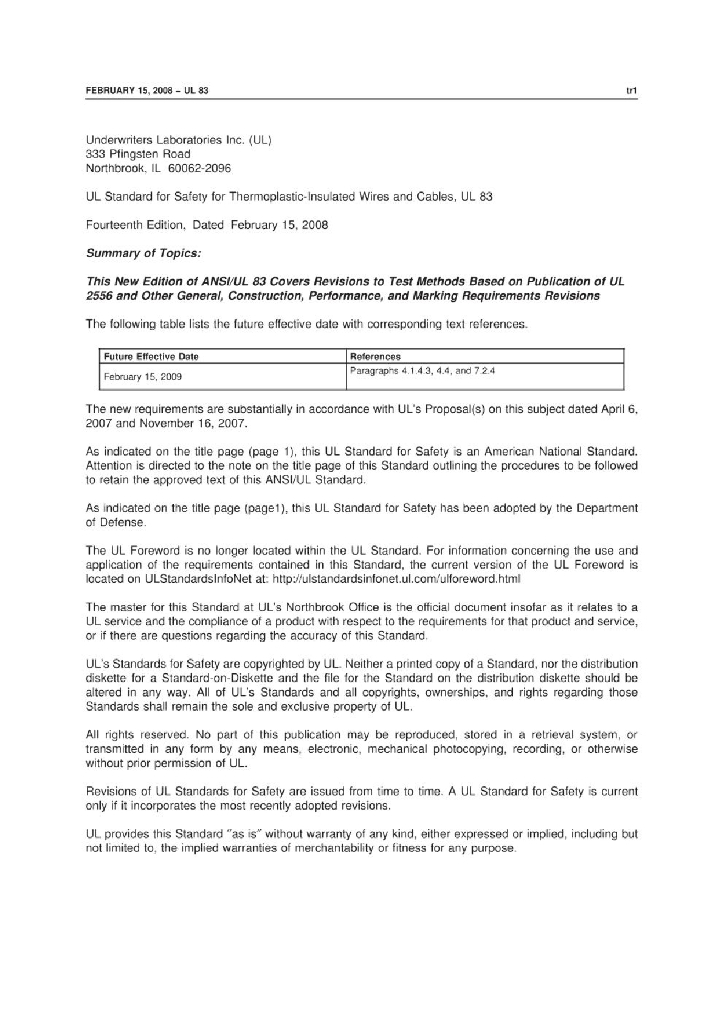 UL 83-2008 热塑性塑料绝缘电线电缆