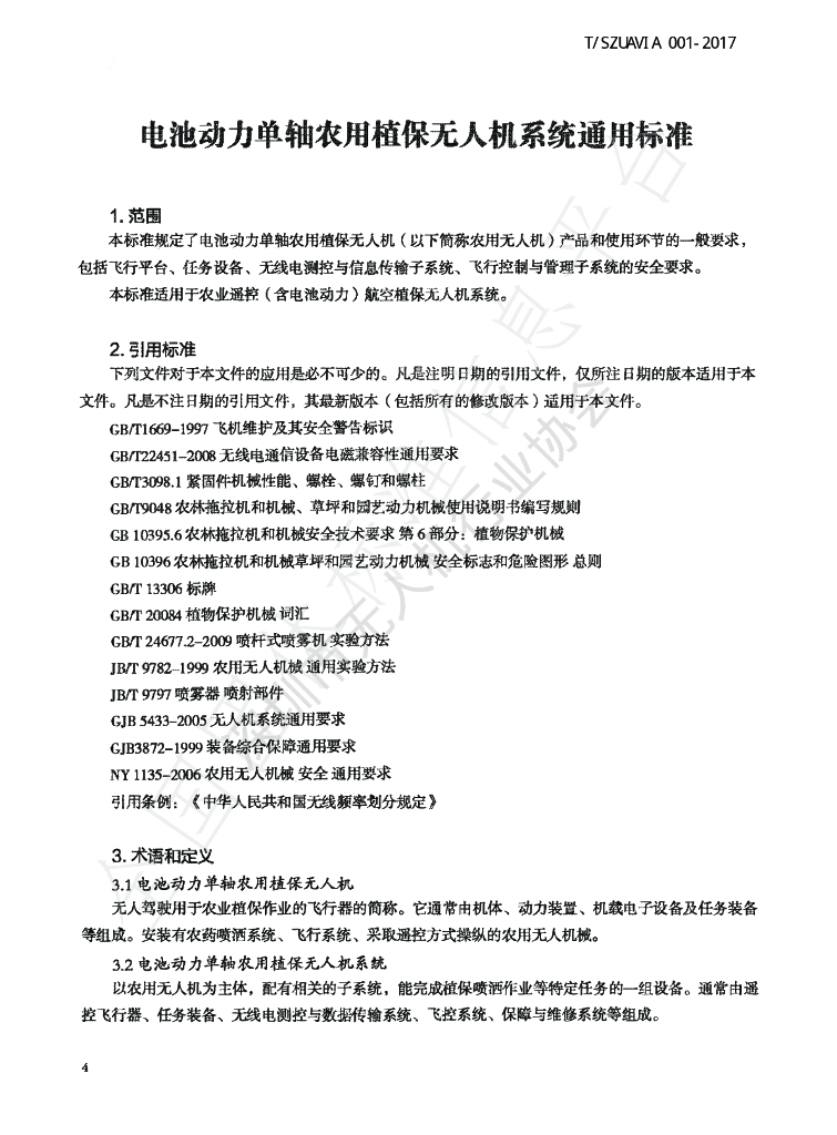 T/SZUAVIA 001-2017 电池动力单轴农用植保无人机系统通用要求