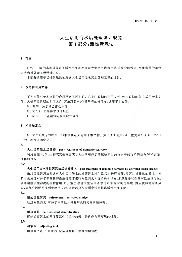 HY/T 168.1-2013 大生活用海水后处理设计规范第1部分:活性污泥法