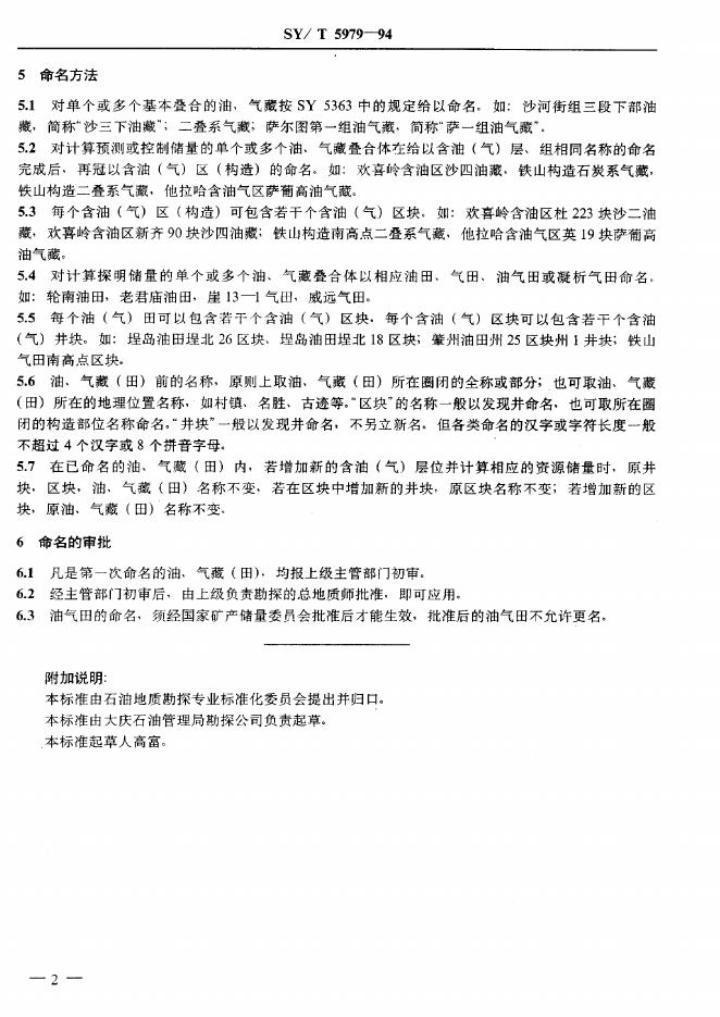 SY/T 5979-1994 石油天然气藏(田)命名规范