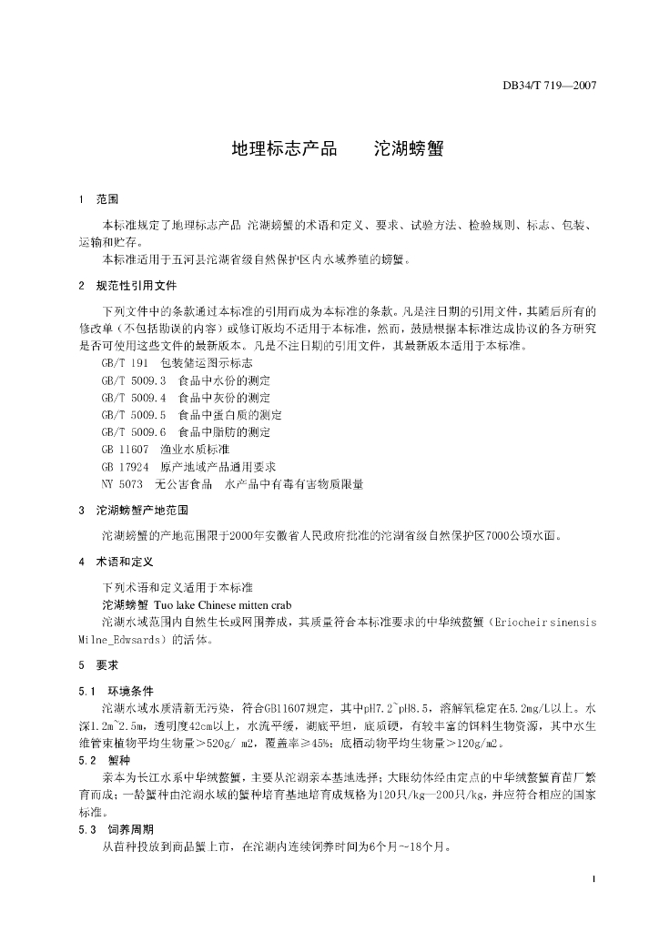 DB34/T 719-2007 地理标志产品 沱湖螃蟹