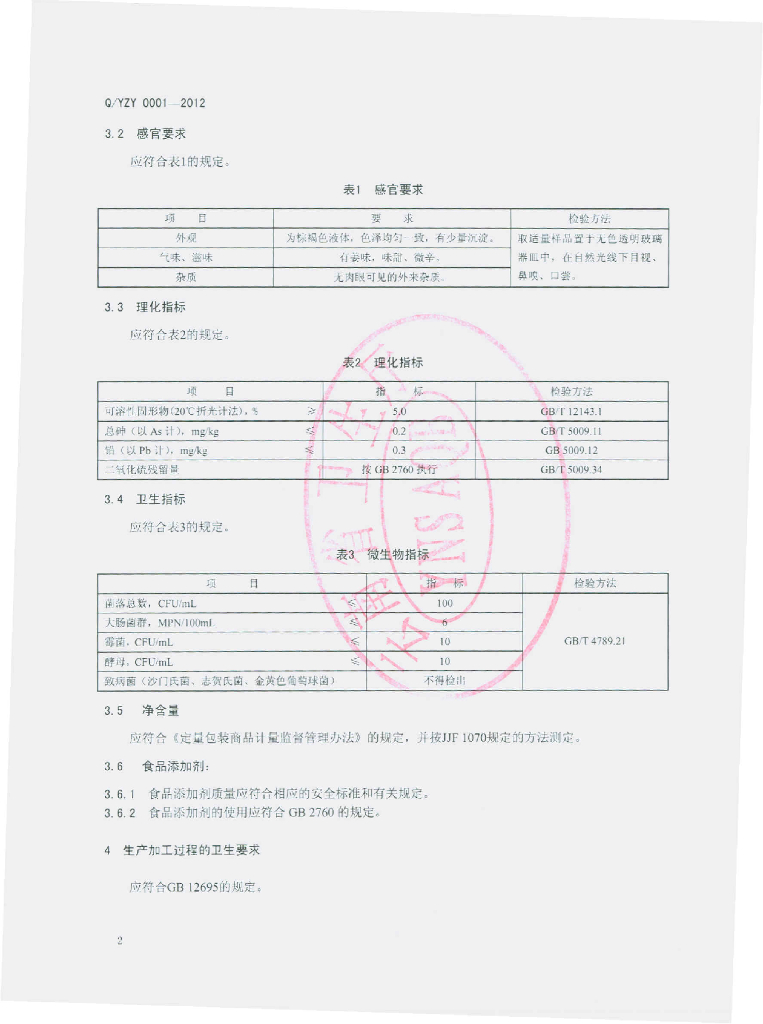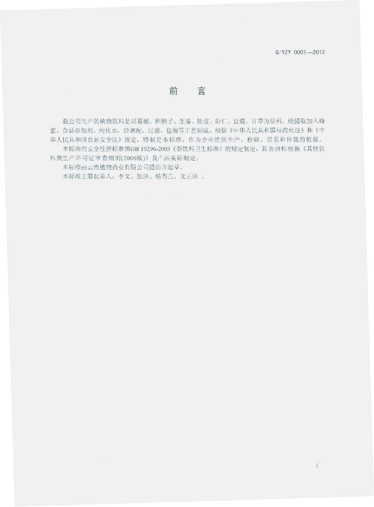 Q/YZY 0001S-2012 植物饮料