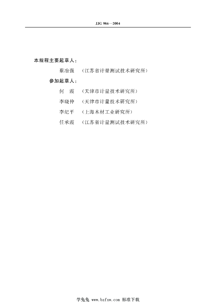 蔡冶强(江苏省计量测试技术研究所)、何霞(天津市计量技术研究所)、李晓仲(天津市计量技术研究所)、李纪平(上海木材工业研究所)、任承霞(江苏省计量测试技术研究所)