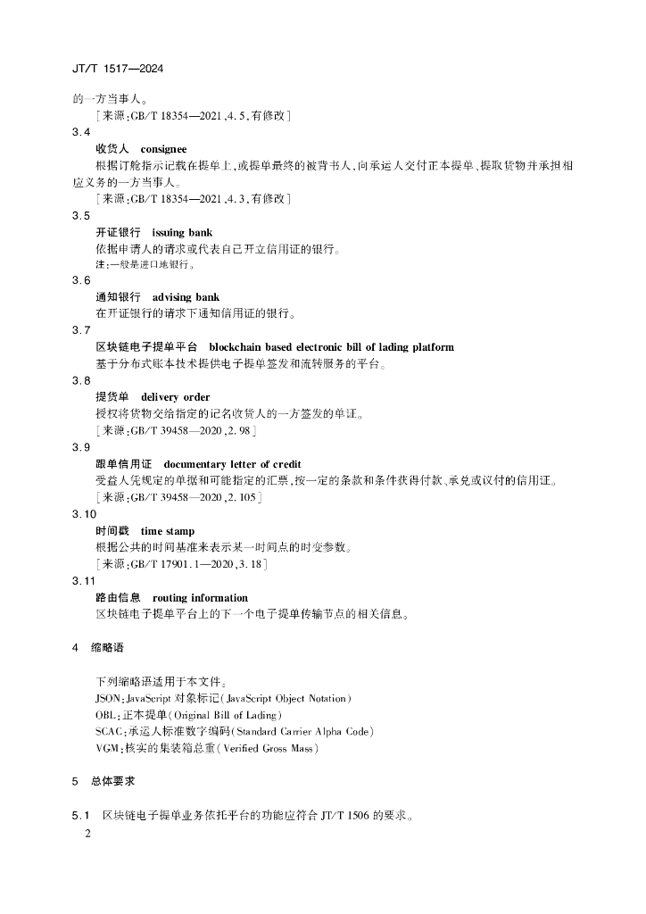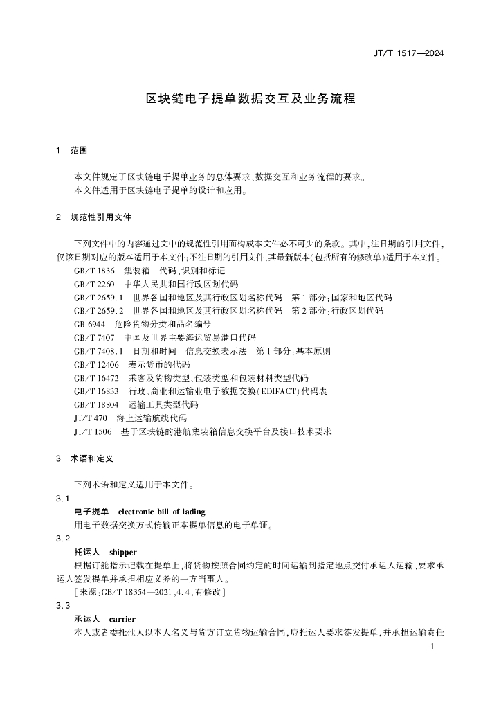 JT/T 1517-2024 区块链电子提单数据交互及业务流程