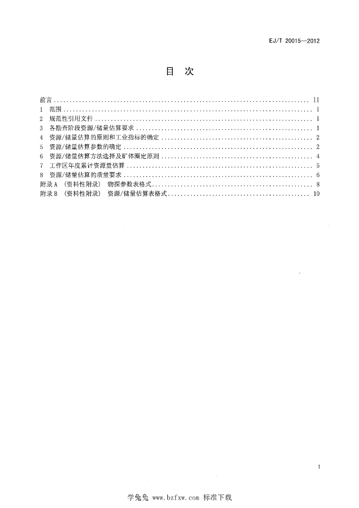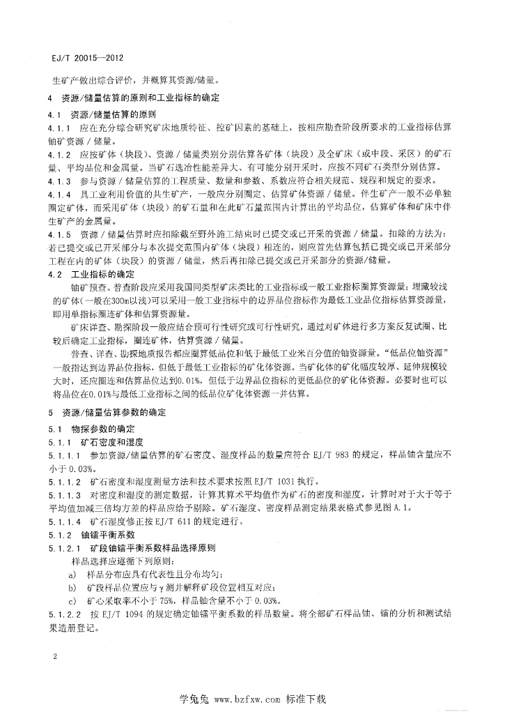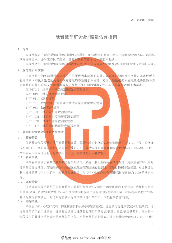EJ/T 20015-2012 硬岩型铀矿资源储量估算指南