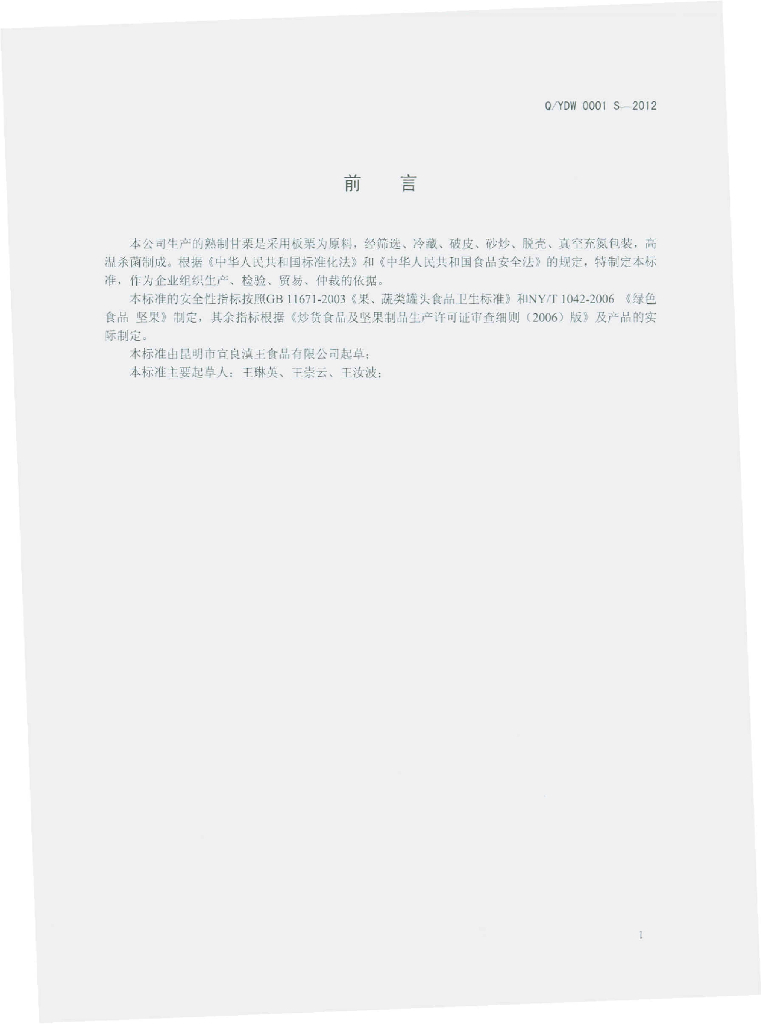 Q/YDW 0001S-2012 滇王熟制甘栗