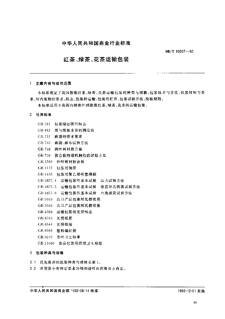 SB/T 10037-1992 红茶、绿茶、花茶运输包装