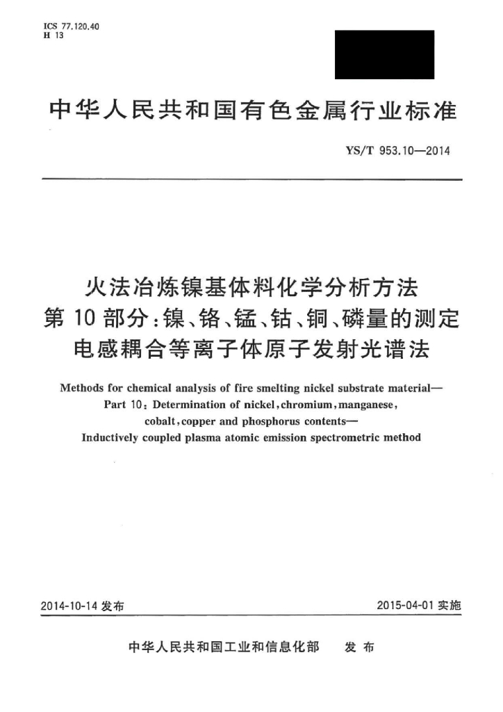 YS/T 953.10-2014 火法冶炼镍基体料化学分析方法 第10部分:镍、铬、锰、钴、铜、磷量的测定电感耦合等离子体原子发射光谱法