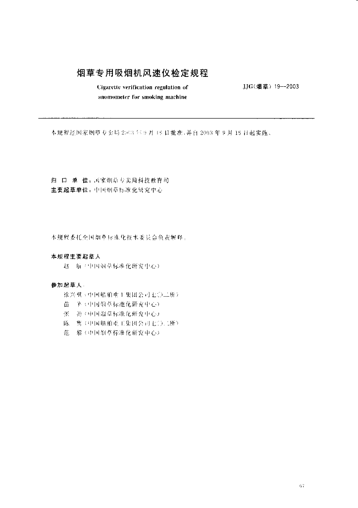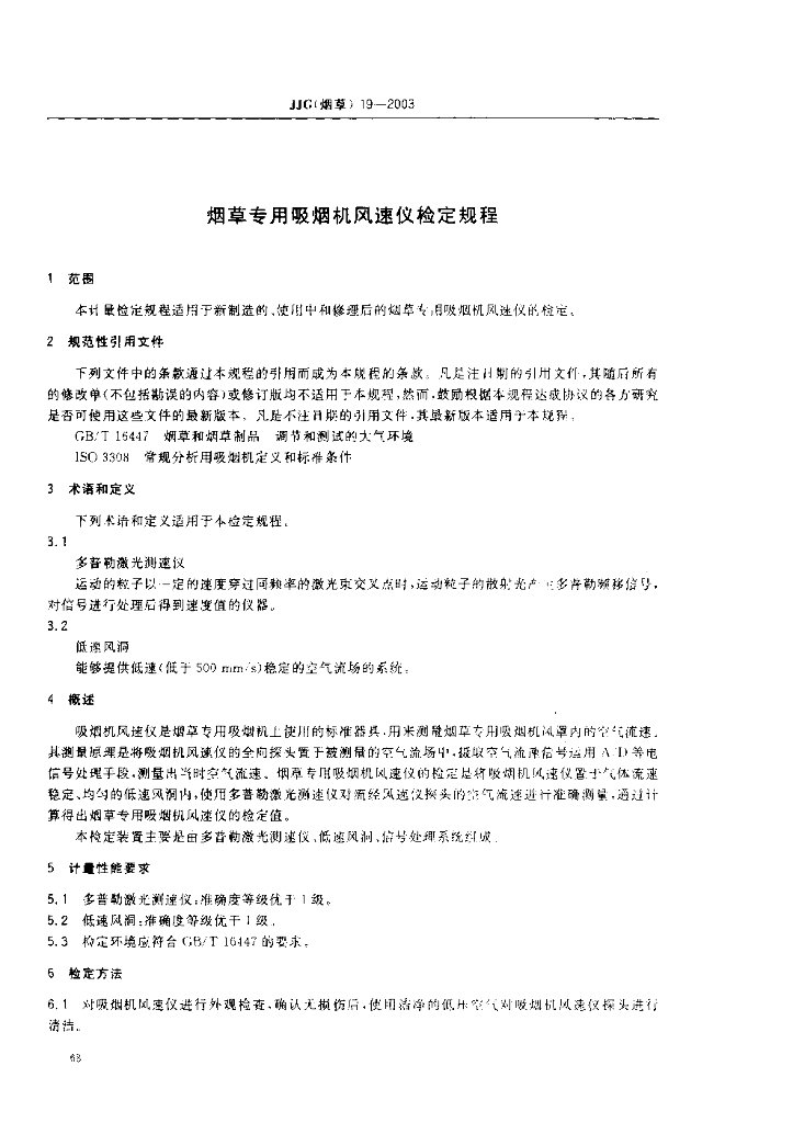 JJG(烟草)19-2003 烟草专用吸烟机风速仪检定规程
