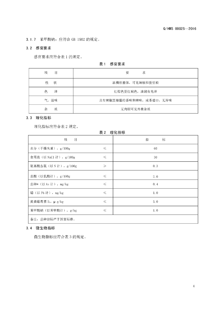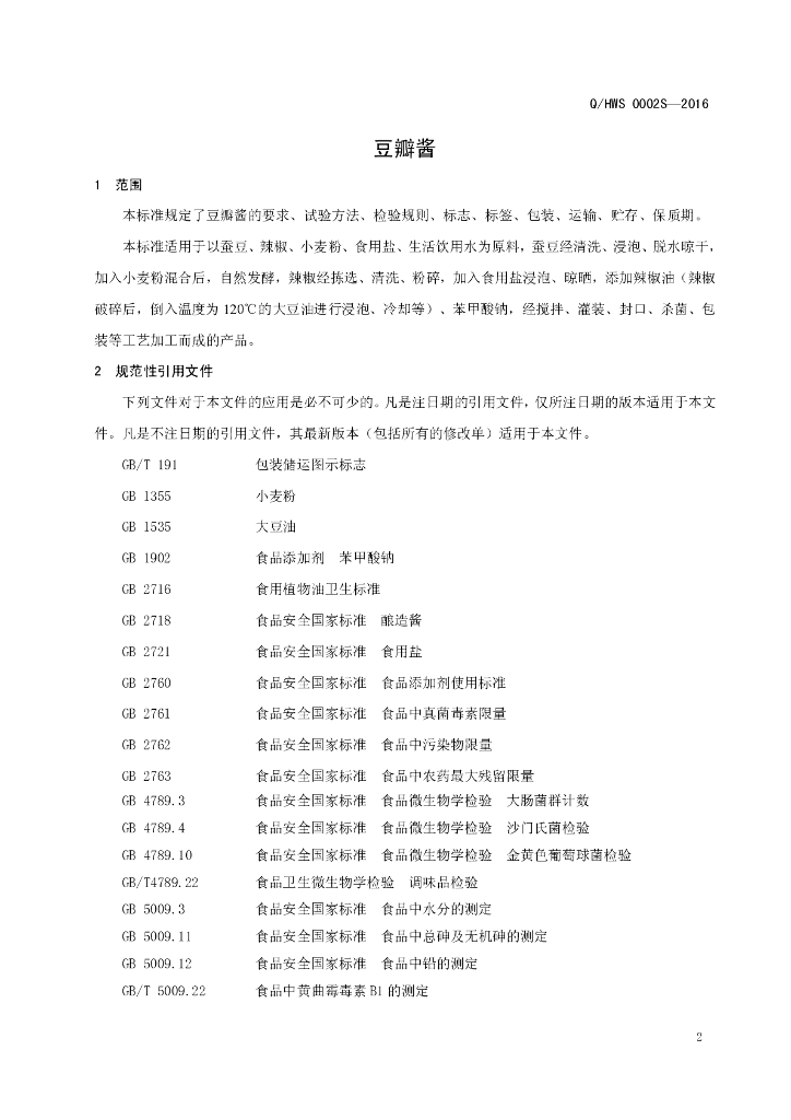 Q/HWS 0002S-2016 河南王胖子食品有限公司 豆瓣酱
