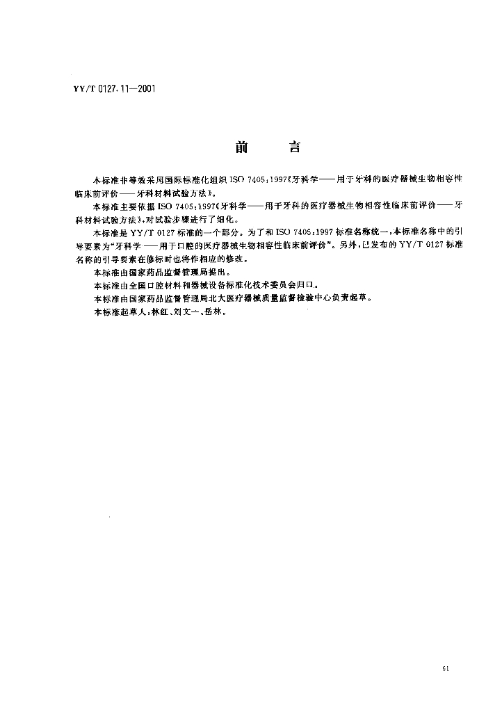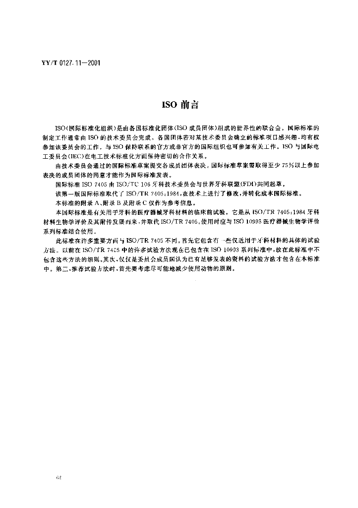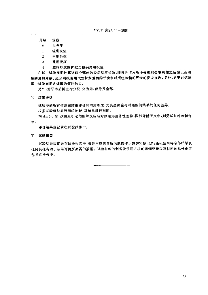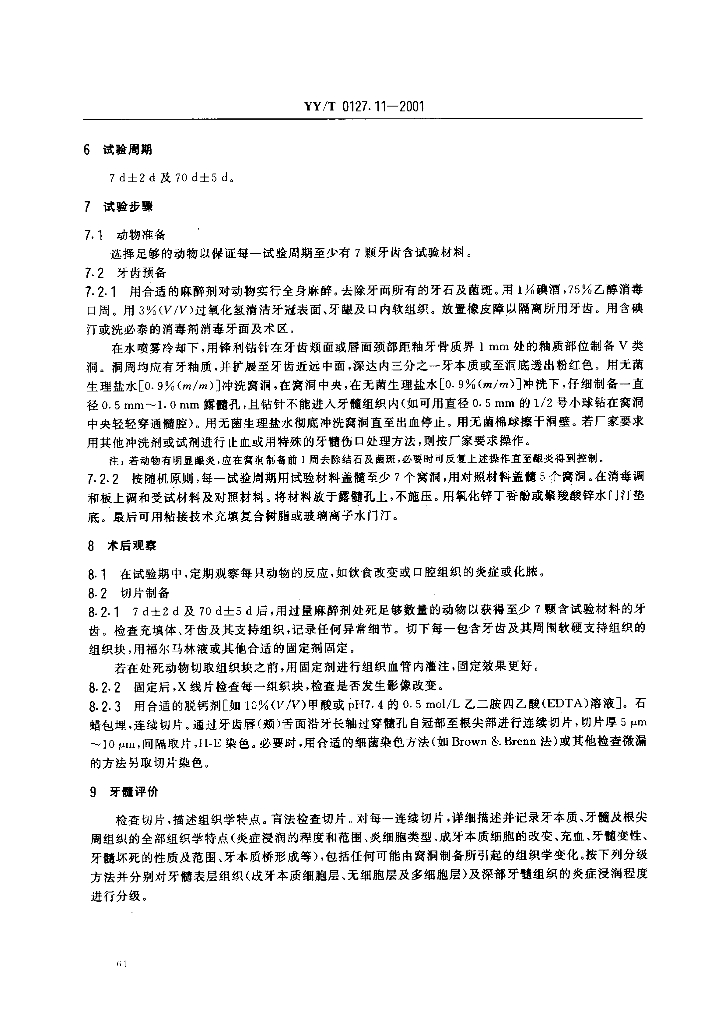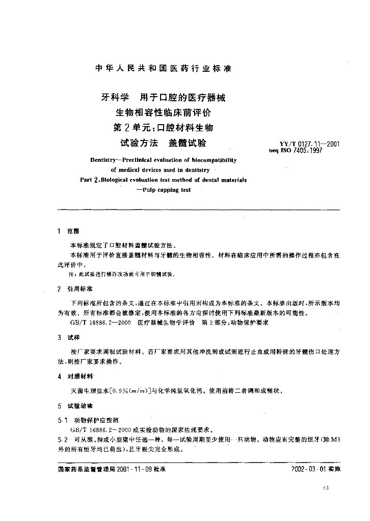 YY/T 0127.11-2001 牙科学用于口腔的医疗器械生物相容性临床前评价 第2单元:口腔材料生物试验方法盖 髓试验