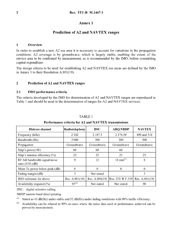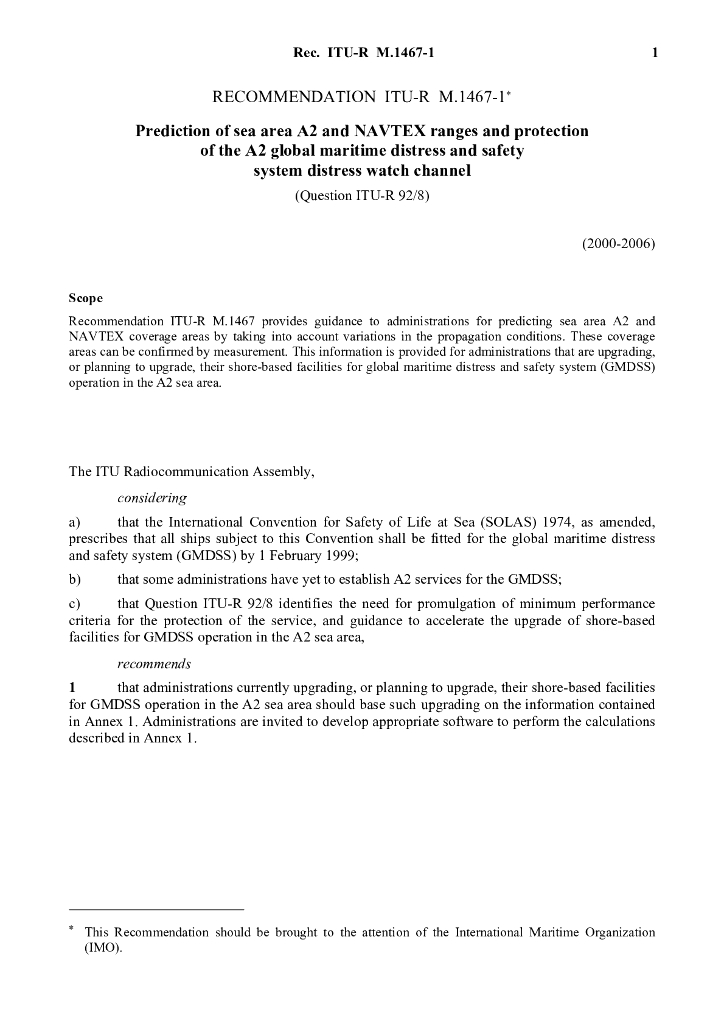 ITU-R M.1467-1-2006 海洋地区A2和NAVTEX范围预测以及A2全球海难和安全系统的海难监视信道的保护