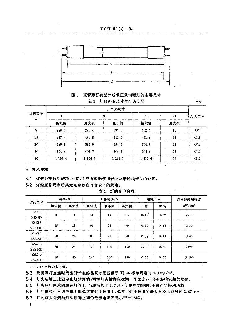 YY/T 0160-1994 直管形石英紫外线低压汞消毒灯