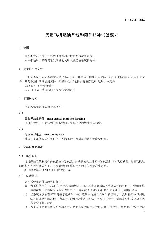 HB 8504-2014(2017) 民用飞机燃油系统和附件结冰试验要求