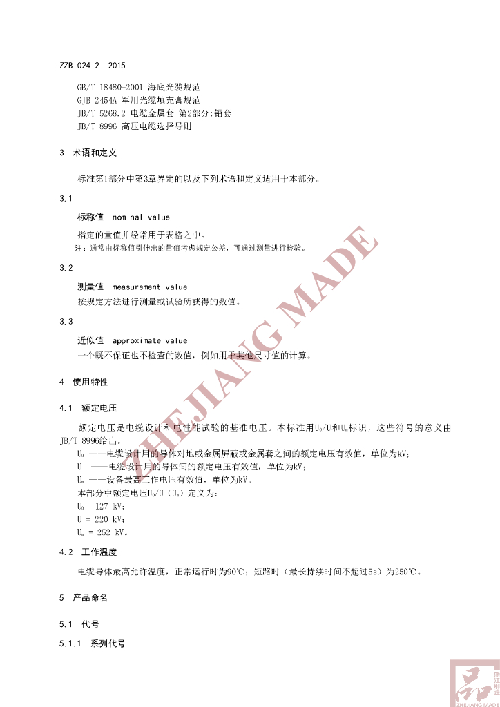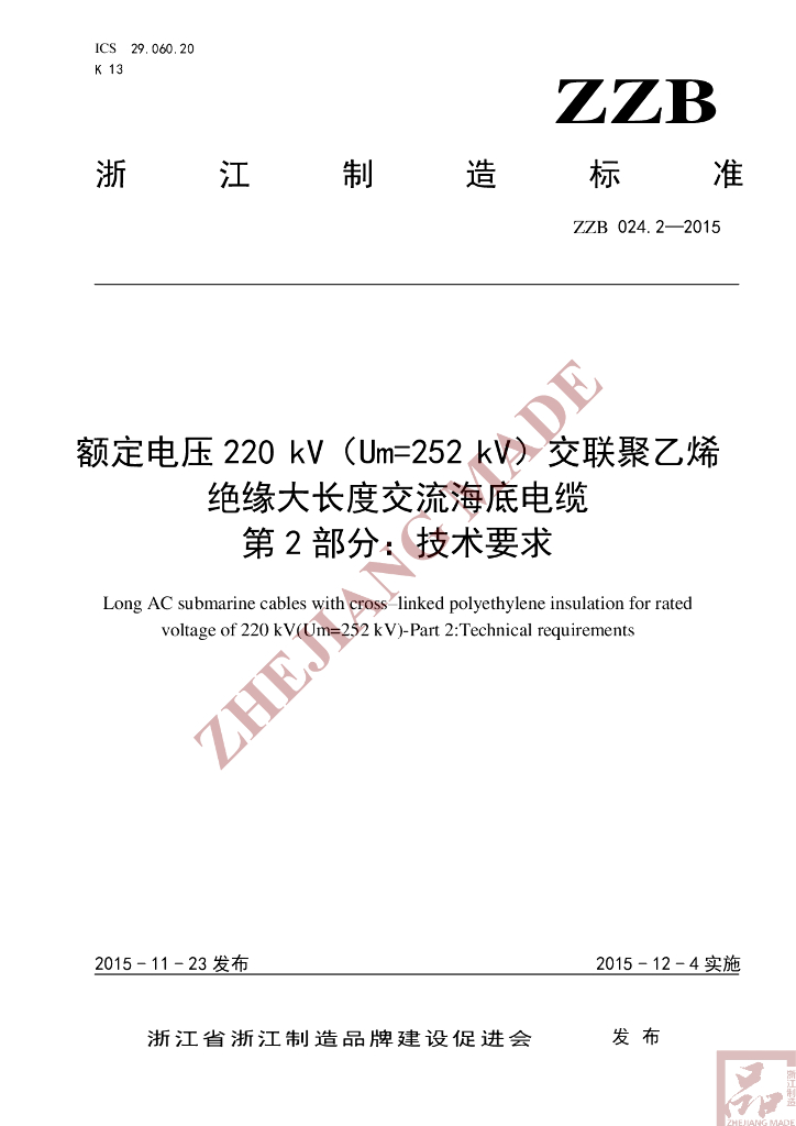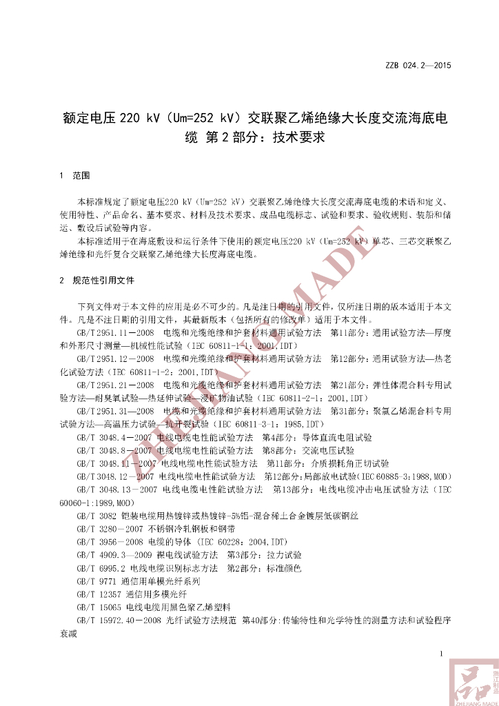 T/ZZB 024.2-2015 额定电压 220 kV(Um=252 kV)交联聚乙烯绝缘大长度交流海底电缆 第2部分:技术要求