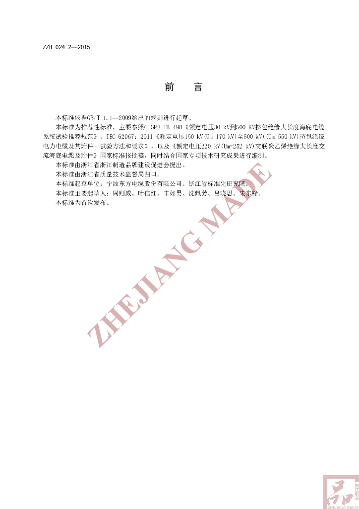 本标准起草单位:宁波东方电缆股份有限公司、浙江省标准化研究院。