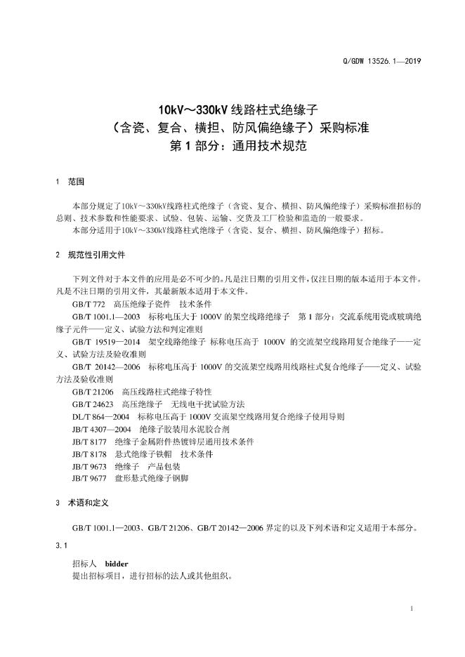Q/GDW 13256.1-2019 10kV~330kV线路柱式绝缘子(含瓷、复合、横担、防风偏绝缘子)采购标准 第1部分:通用技术规范