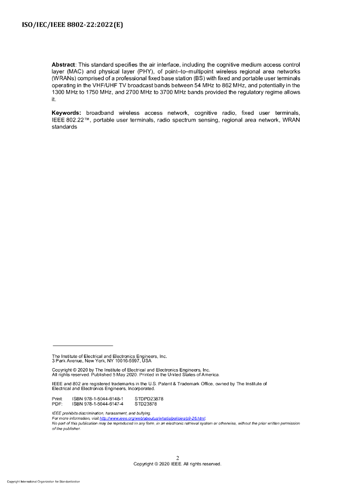 ISO/IEC/IEEE 8802-22-2022 信息技术 系统间远程通信和信息交换 局域网和城域网 特殊要求 第22部分:认知的无线区域网媒体访问控制(MAC)和物理层(PHY)规范:在电视频段操作的政策和规程