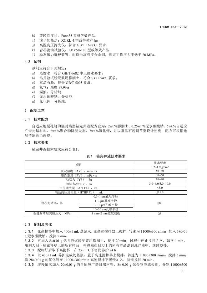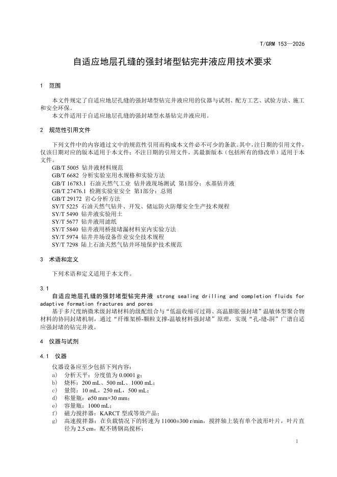 T/GRM 153-2026 自适应地层孔缝的强封堵型钻完井液应用技术要求