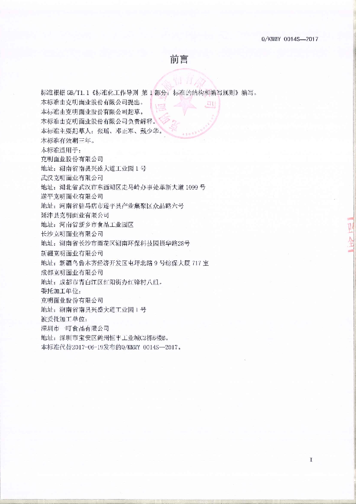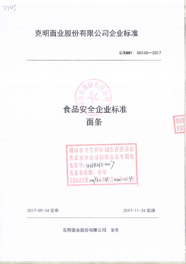 Q/KMMY 0014S-2017 面条