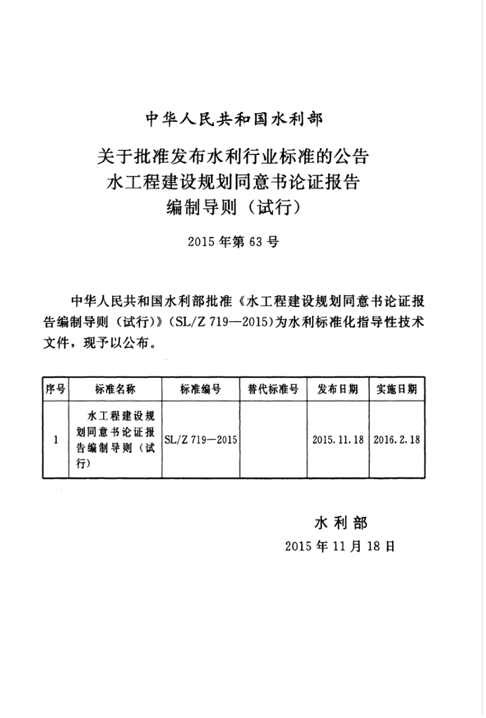 SL/Z 719-2015 水工程建设规划同意书论证报告编制导则(试行)
