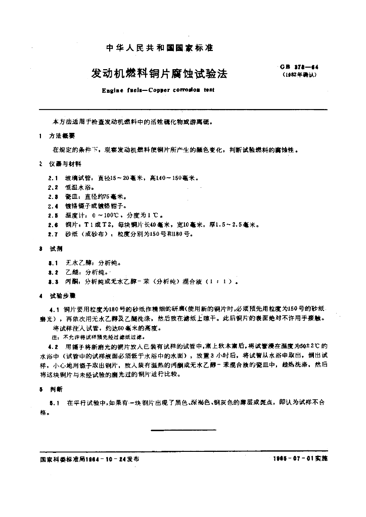 GB/T 378-1964 发动机燃料铜片腐蚀试验法