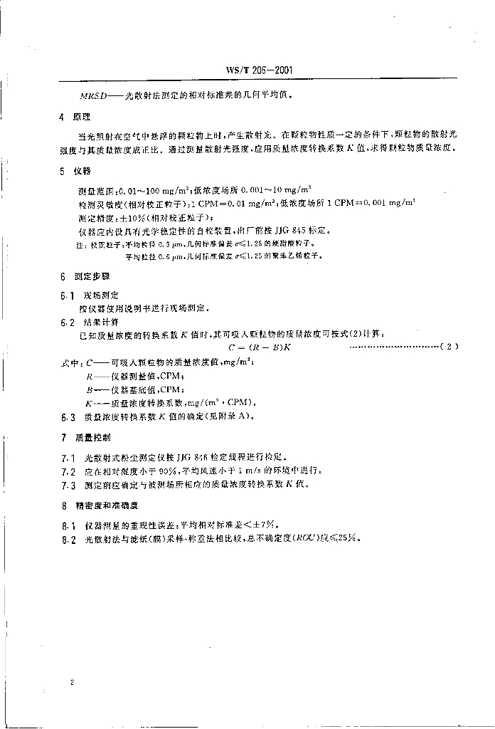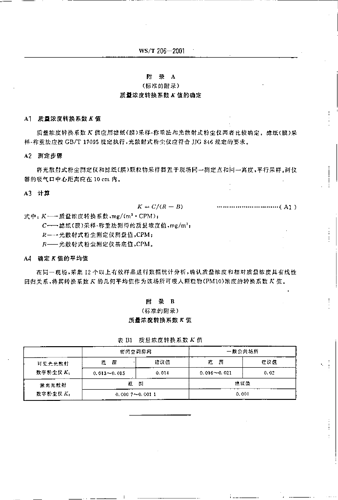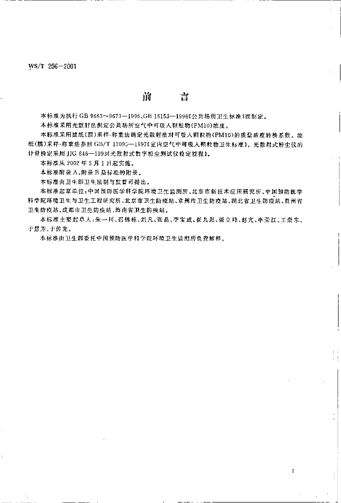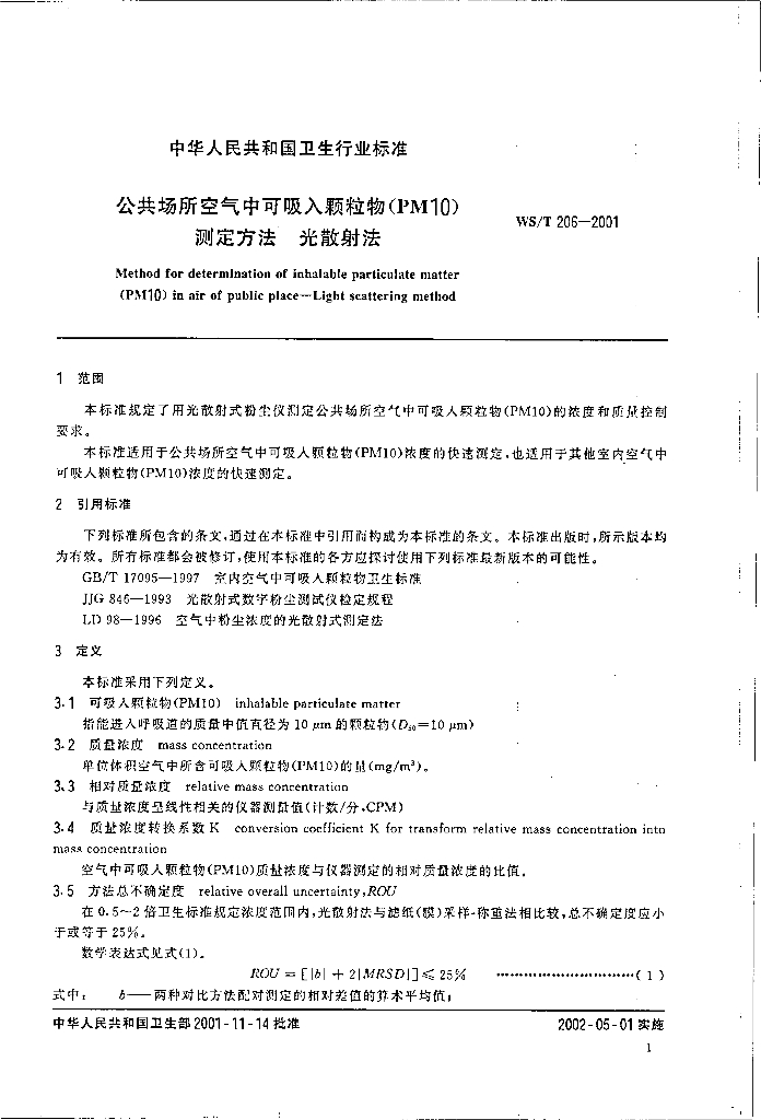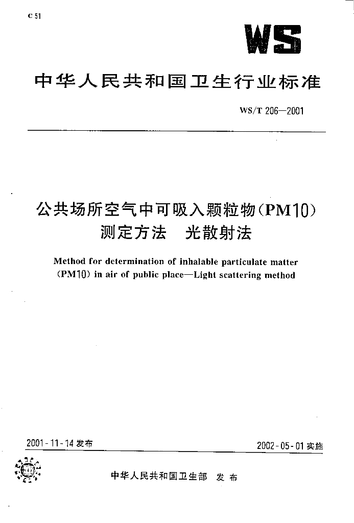 WS/T 206-2001 公共场所空气中可吸入颗粒物(PM10)测定方法 光散射法