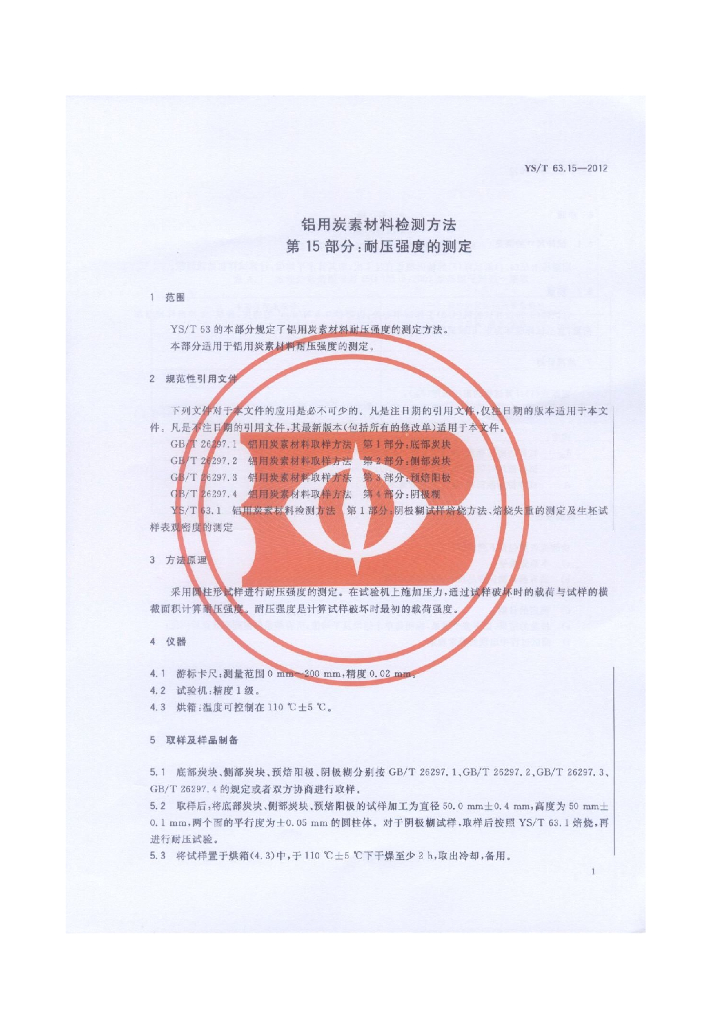 YS/T 63.15-2012 铝用炭素材料检测方法 第15部分:耐压强度的测定