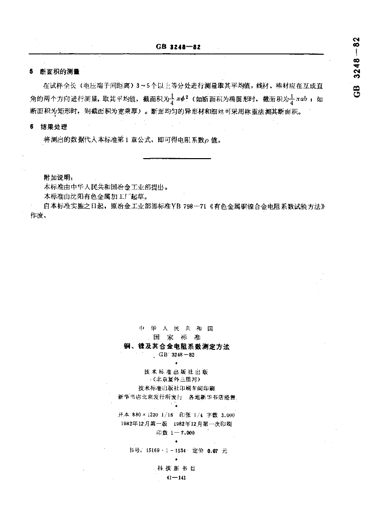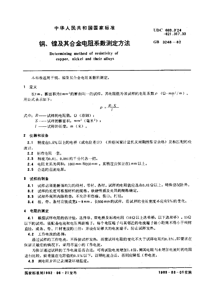 GB/T 3248-1982 铜,镍及其合金电阻系数测定方法