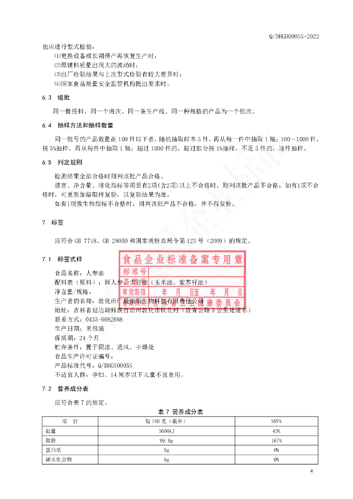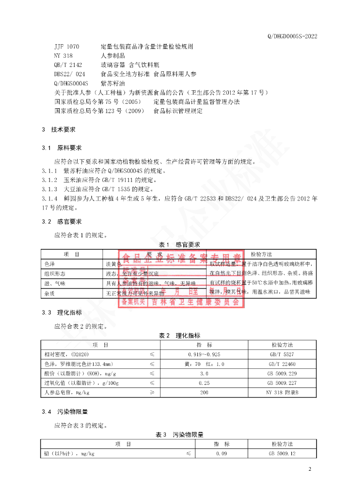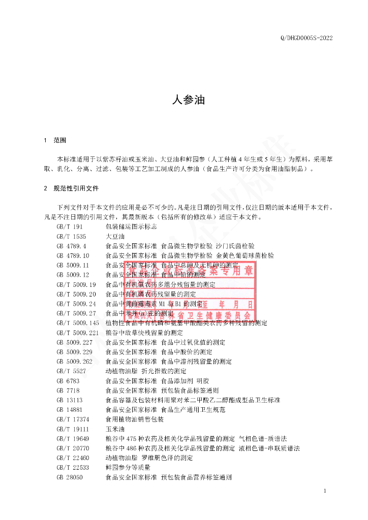 Q/DHGD 0005S-2022 人参油