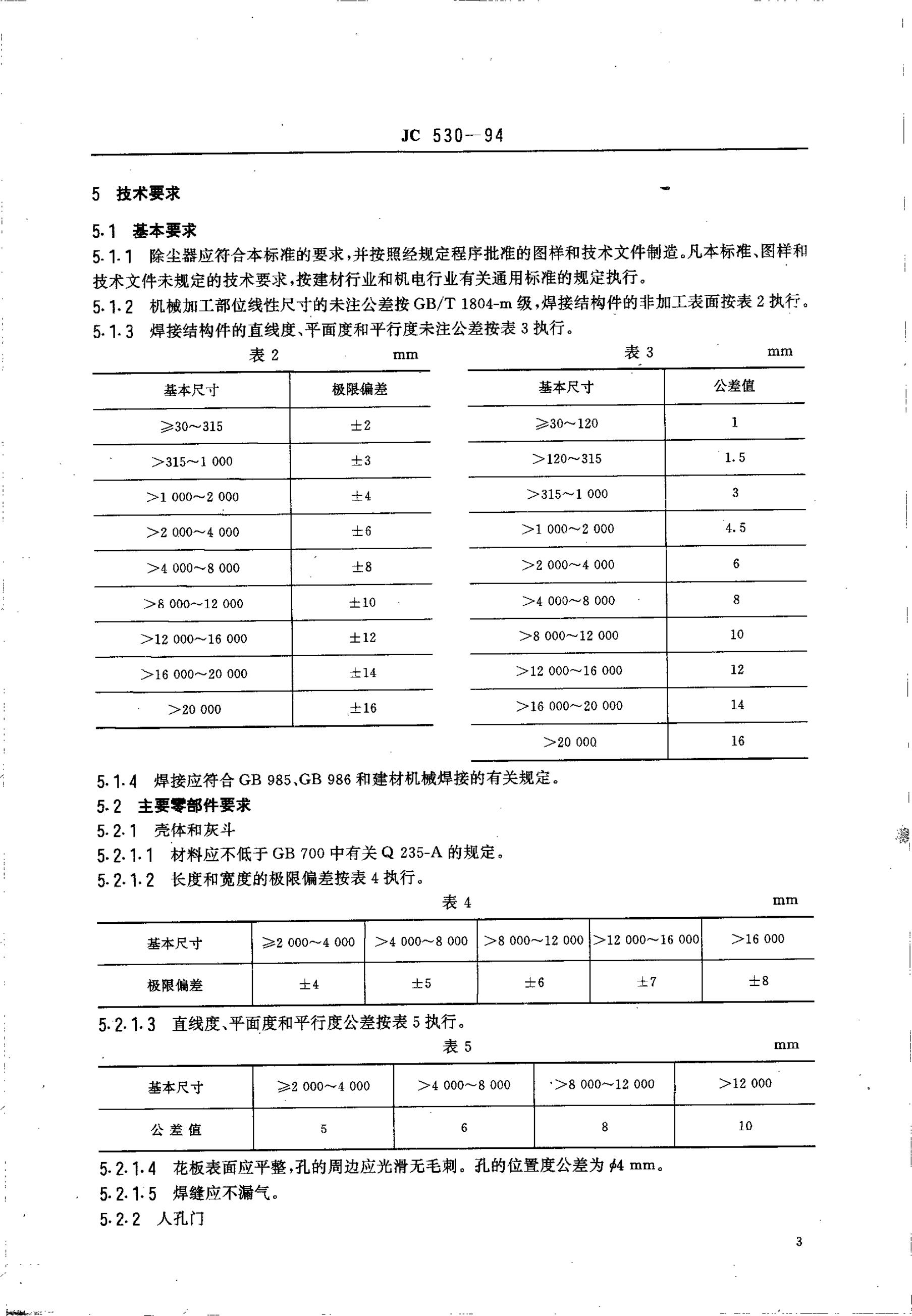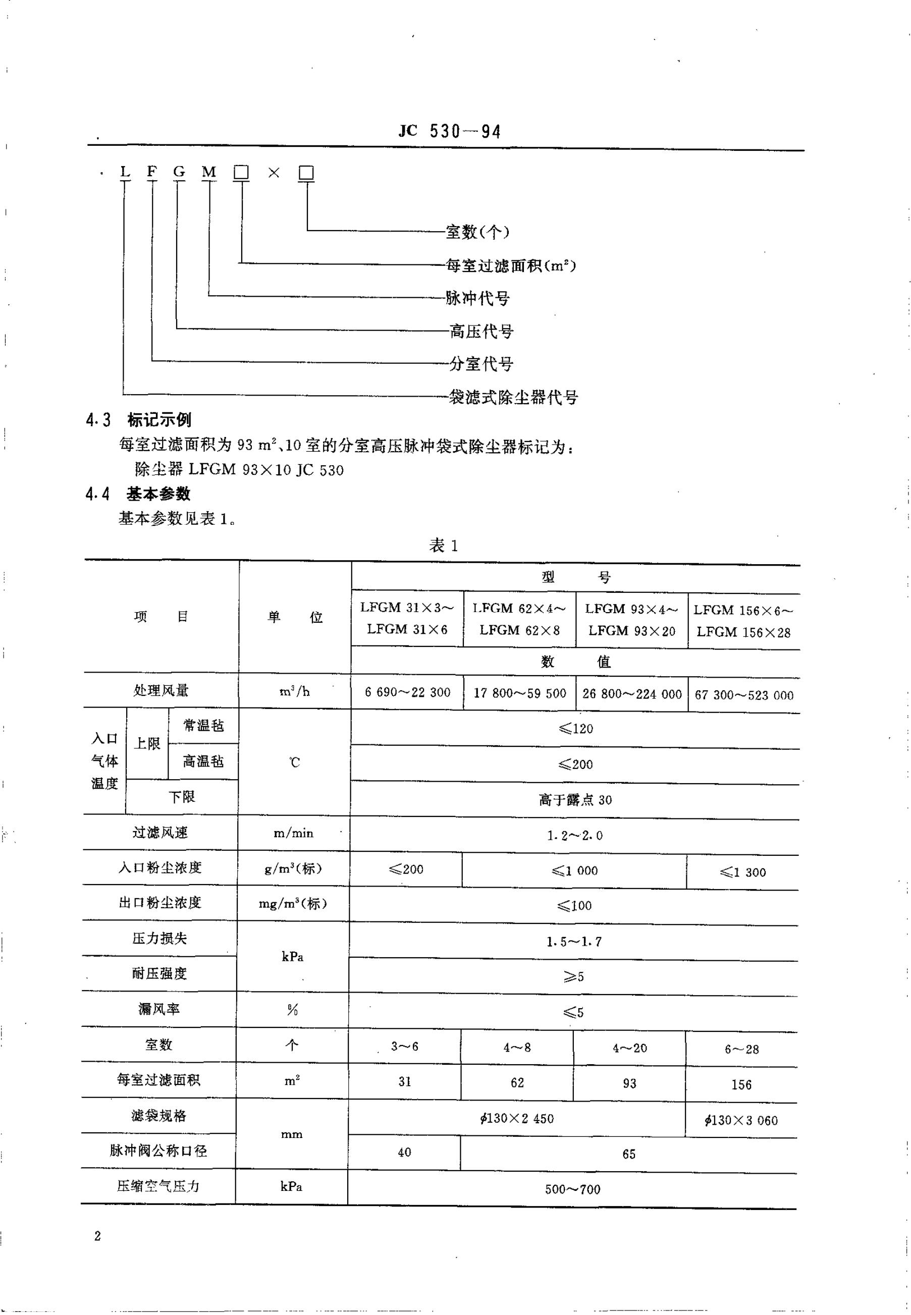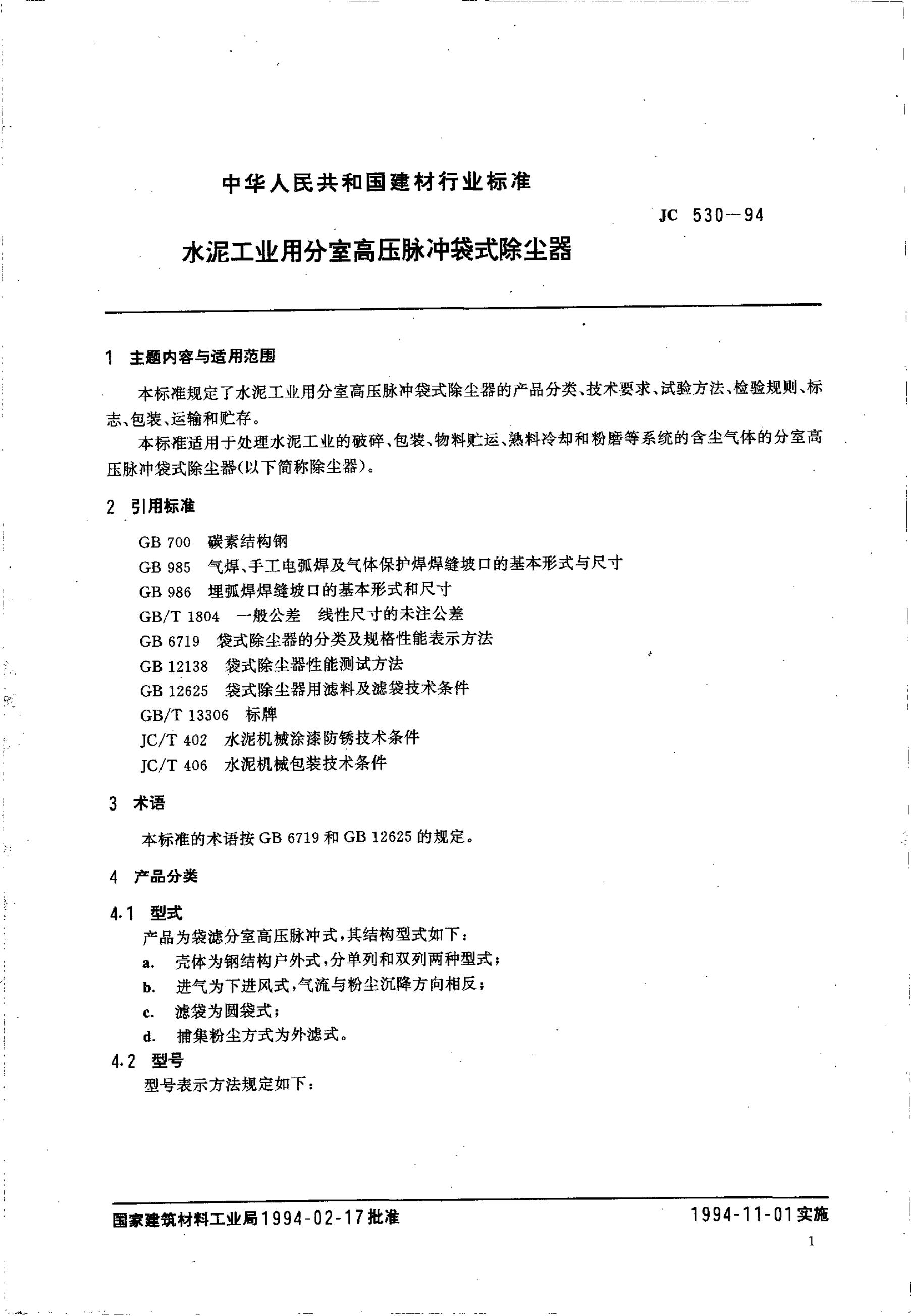 JC 530-1994 水泥工业用分室高压脉冲袋式除尘器