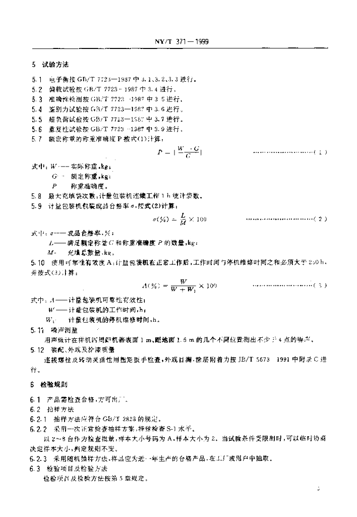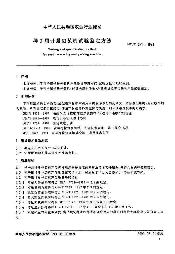 NY/T 371-1999 种子用计量包装机试验鉴定方法