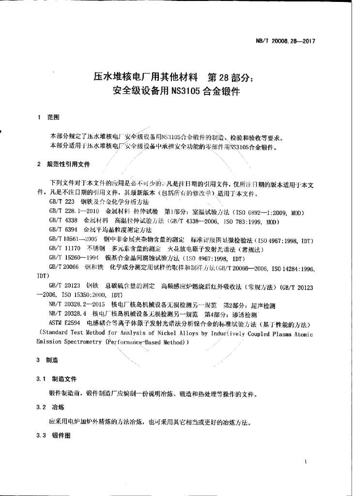 NB/T 20008.28-2017 压水堆核电厂用其他材料 第28部分:安全级设备用NS3105合金锻件