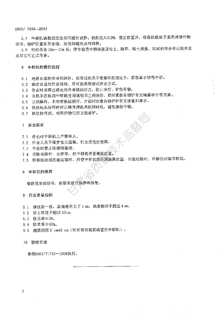 DB62/T 316-2011 中耕机操作规程及作业质量验收