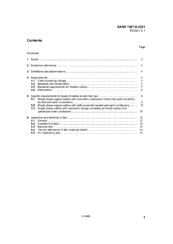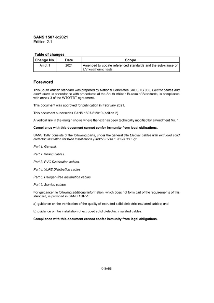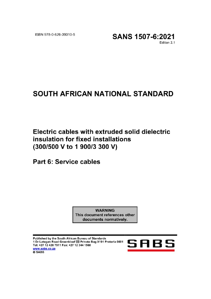 SANS 1507-6:2021 固定敷设用挤包固体电介质绝缘电缆(300 500V到1900 3300V) 第6部分 伺服电缆