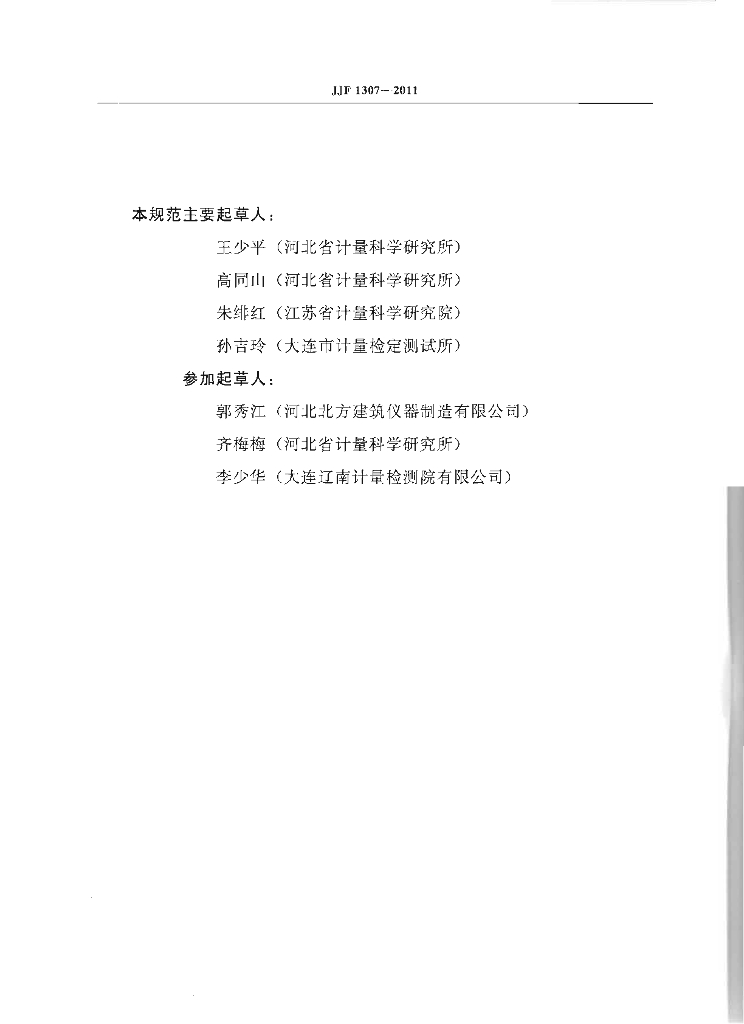 王少平(河北省计量科学研究所)、高同山(河北省计量科学研究所)、朱绯红(江苏省计量科学研究院)、孙吉玲(大连市计量检定测试所)、郭秀江(河北北方建筑仪器制造有限公司)、齐梅梅(河北省计量科学研究所)、李少华(大连辽南计量检测院有限公司)