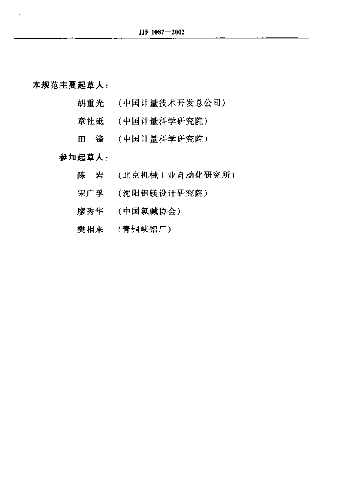 胡重光(中国计量技术开发总公司)、章社砥(中国计量科学研究院)、田锋(中国计量科学研究院)、陈岩(北京机械工业自动化研究所)、宋广孚(沈阳铝镁设计研究院)、廖秀华(中国氯碱协会)、樊相来(青铜峡铝厂)