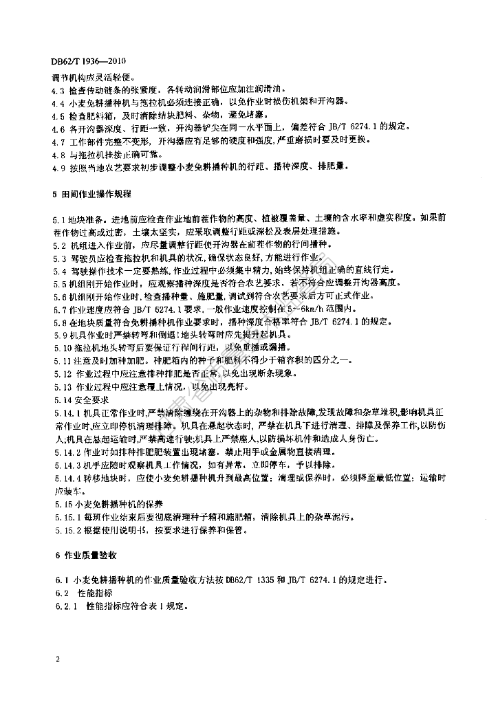 DB62/T 1936-2010 小麦免耕播种机操作规程及作业质量验收