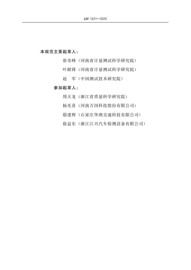 张奇峰(河南省计量测试科学研究院);叶献锋(河南省计量测试科学研究院);赵军(中国测试技术研究院);周天龙(浙江省质量科学研究院);杨见喜(河南万国科技股份有限公司);邸建辉(石家庄华燕交通科技有限公司);徐益东(浙江江兴汽车检测设备有限公司)
