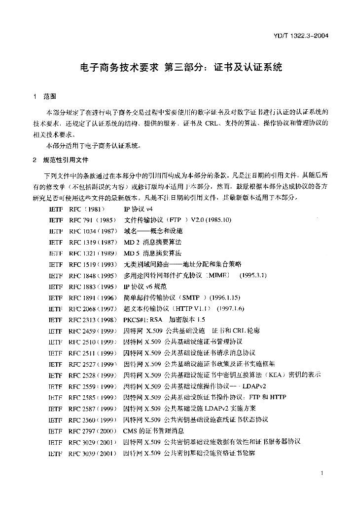 YD/T 1322.3-2004 电子商务技术要求 第三部分:证书及认证系统
