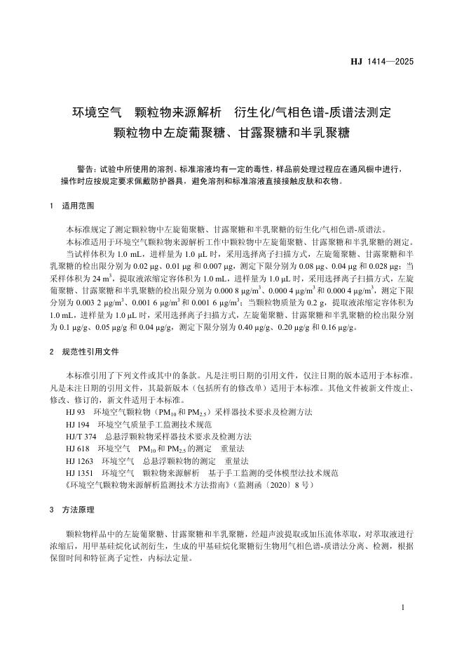 HJ 1414-2025 环境空气 颗粒物来源解析 衍生化_气相色谱-质谱法测定颗粒物中左旋葡聚糖、甘露聚糖和半乳聚糖