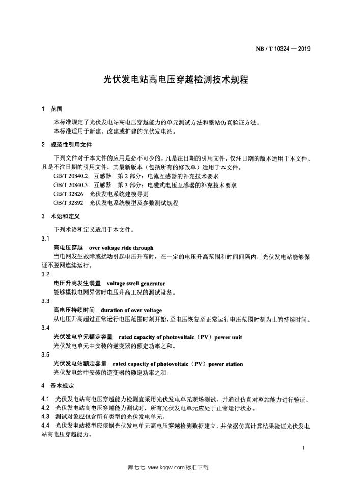 NB/T 10324-2019 光伏发电站高电压穿越检测技术规程