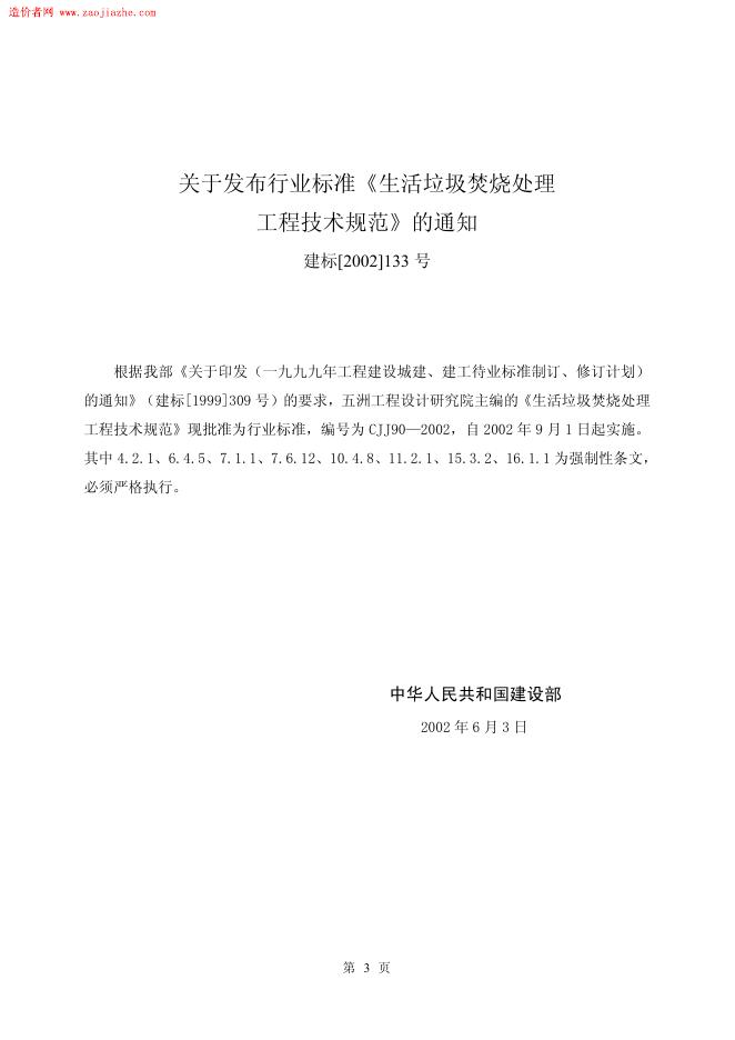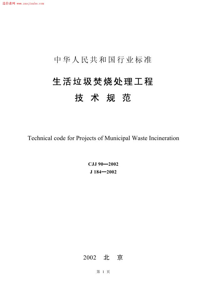 CJJ 90-2002 生活垃圾焚烧处理工程技术规范