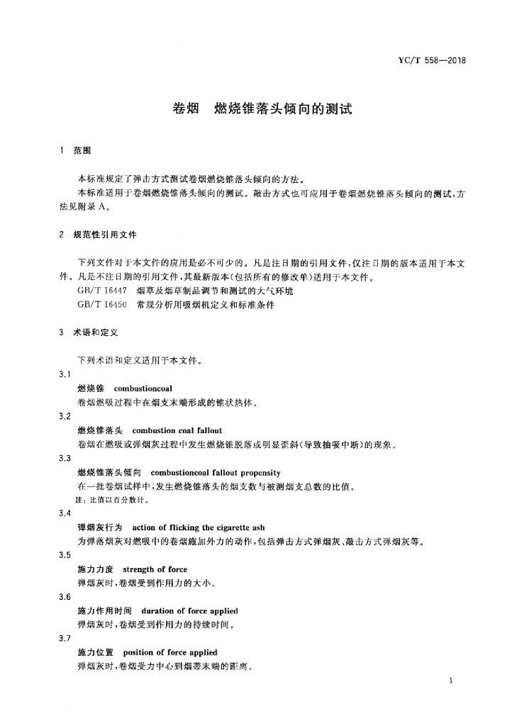 YC/T 558-2018 卷烟燃烧锥落头倾向的测试